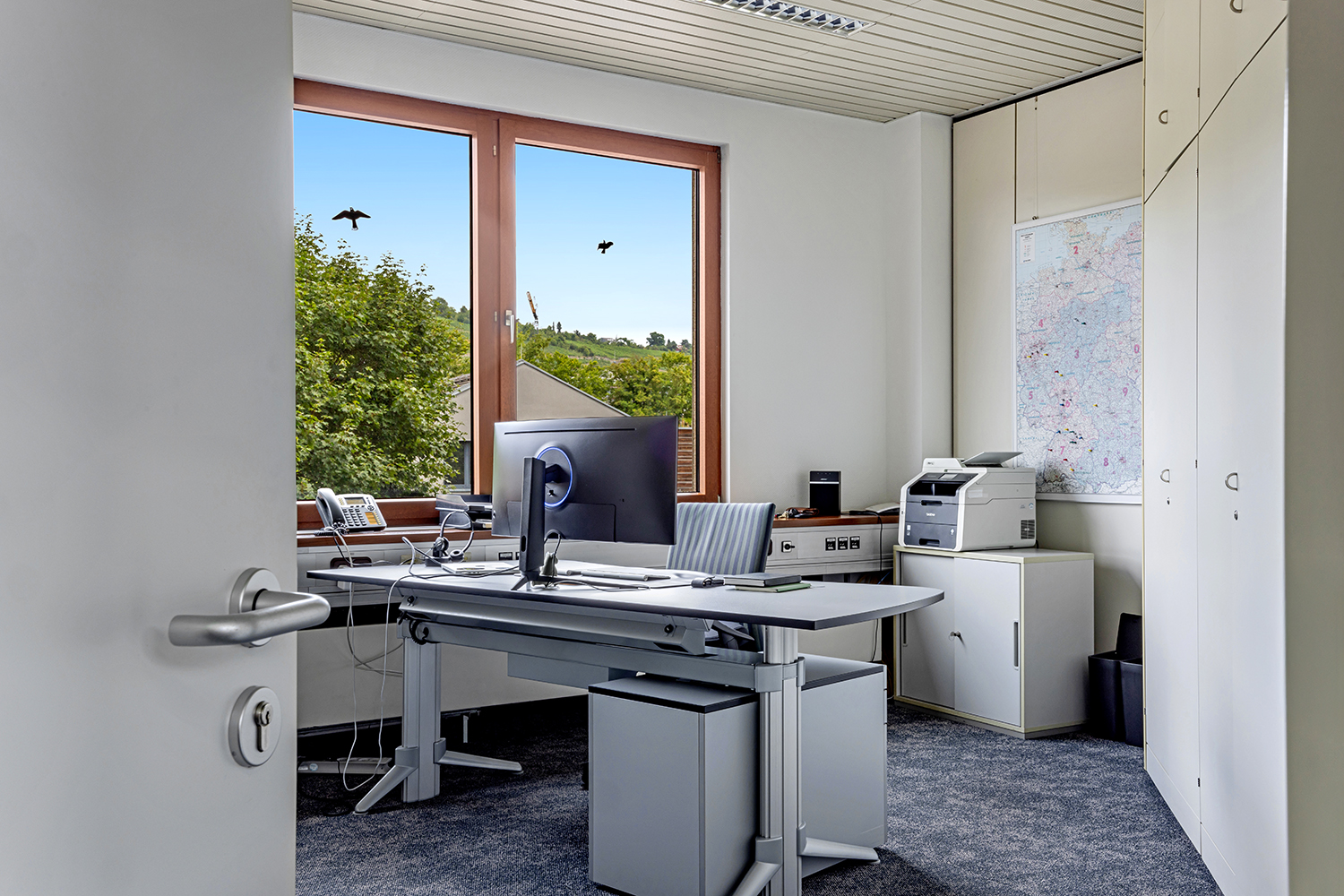 • Komfortable Ausstattung: Arbeitstisch und Arbeitsstuhl, Besucherstühle, Schreibtisch-Container, Aktenschrank und ein Garderobenschrank.